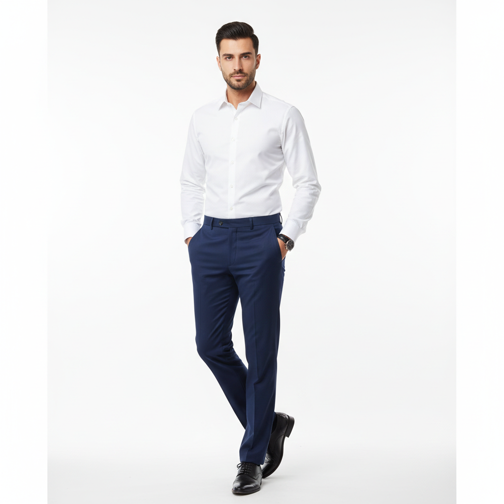 Design & Waistband: Classic navy color with a structured waistband and belt loops for a polished fit.